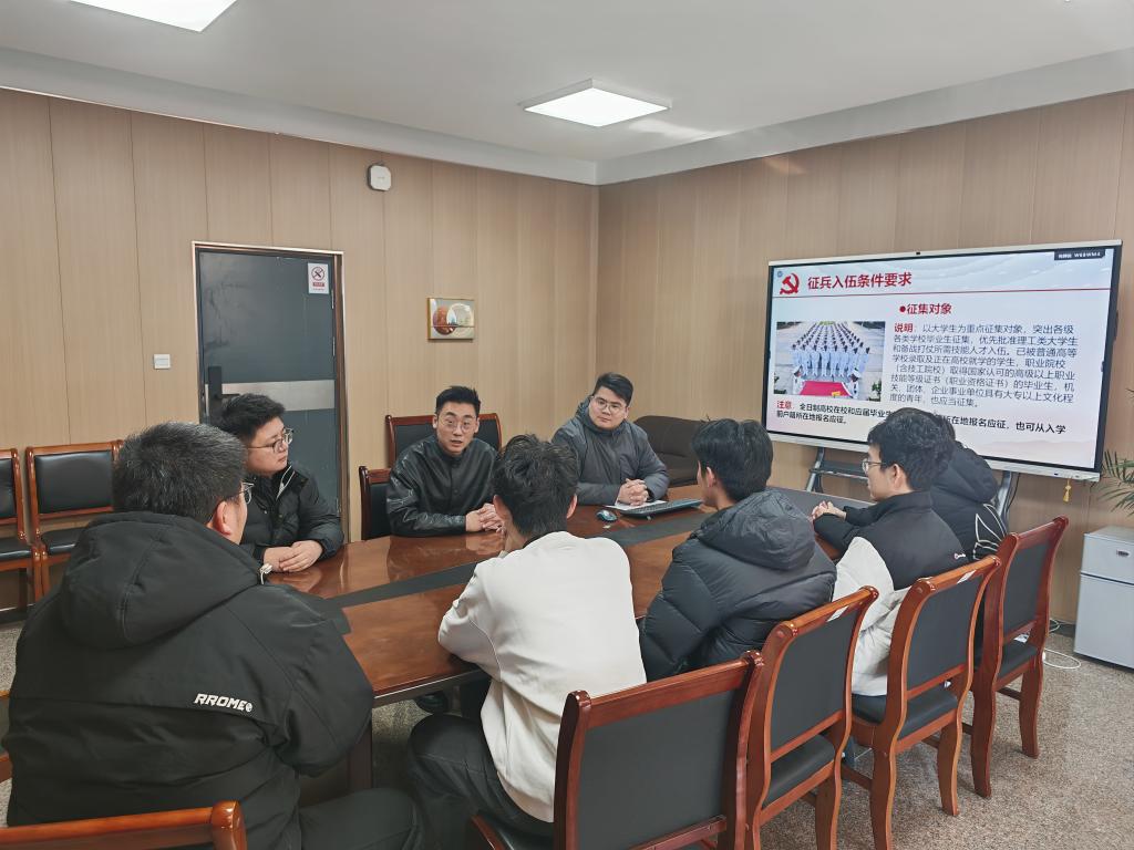为深入贯彻落实国家征兵工作部署,激发青年学子投身国防、报效祖国的热情,帮助同学们全面了解征兵政策、明晰入伍路径,1月5日,理学院在A215会议室开展2026年上半年征兵座谈动员会。学院党委副书记、副院长薛诚,相关辅导员以及数名有参军意向的同学参加活动。
