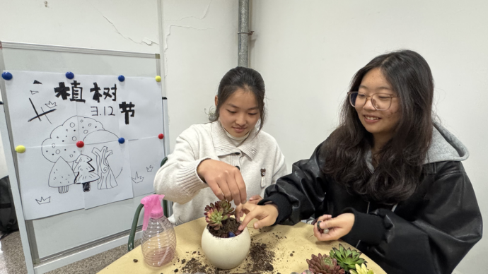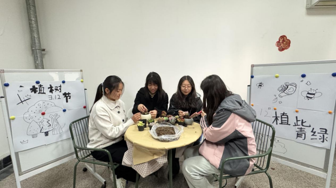 绿意角设计感受美丽绿色。宣讲活动结束后,同学们在主教楼学A113教室进行了校园“绿意角”设计与体验活动,通过动手设计和布置绿意角,将绿植领养、绿意感受融为一体。当一盆盆多肉被错落有致地摆放在阅读区、交流角,绿意角不仅成为校园内的一处清新景致,更被赋予"生命教育微课堂"的功能。
