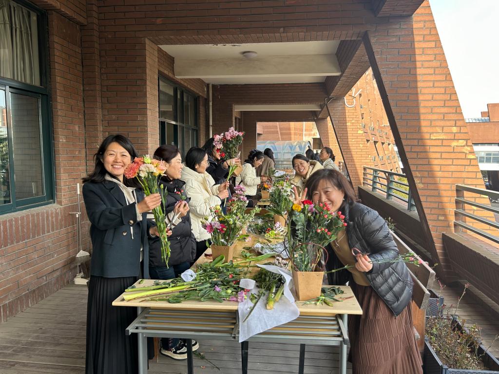 活动现场,花香四溢,春意融融。平日忙碌于教学、科研与管理一线的女教师们暂时放下手头工作,全身心投入创作。她们巧手翻飞,修剪枝叶、设计造型,将向日葵、康乃馨、玫瑰、洋桔梗等各色花卉与绿植精心组合,赋予其独特的美感与意境。