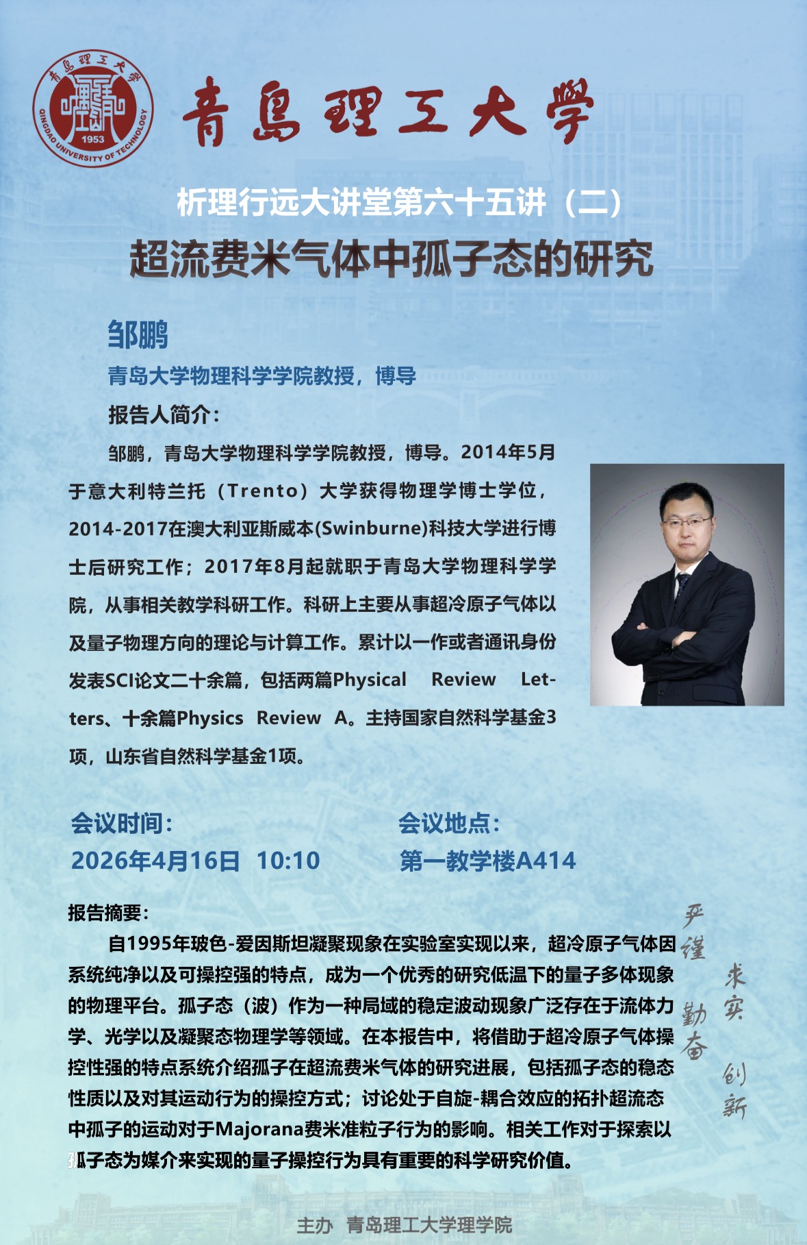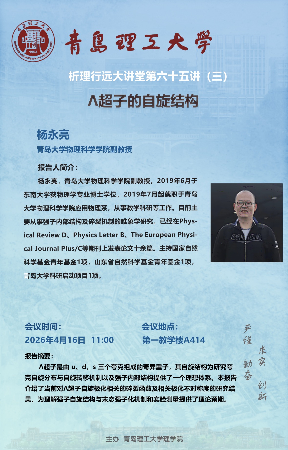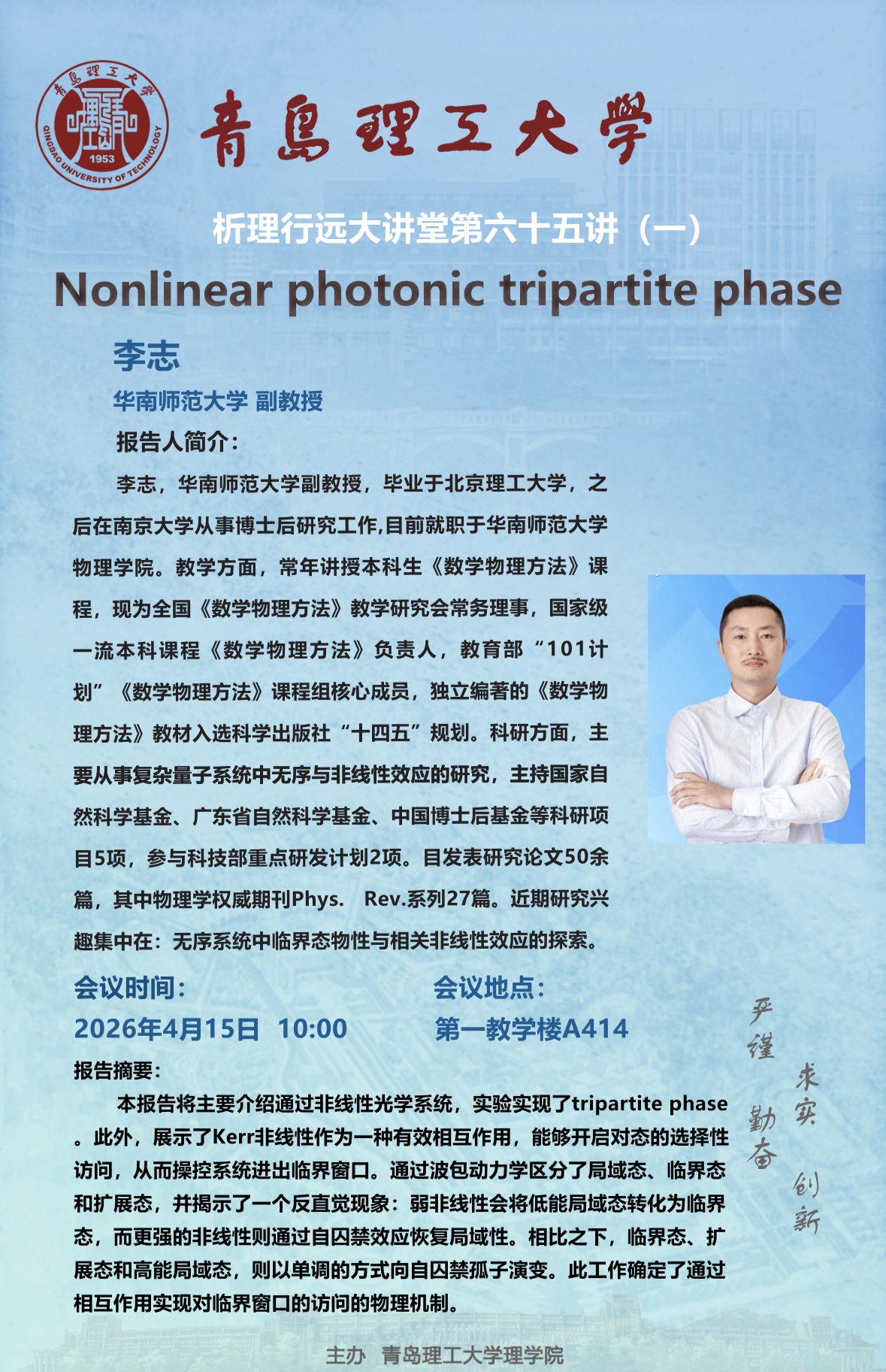 析理行远大讲堂第六十五讲(一)Nonlinear photonic tripartite phase、(二)超流费米气体中孤子态的研究、(三)Λ超子的自旋结构