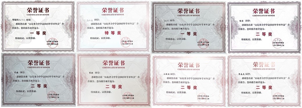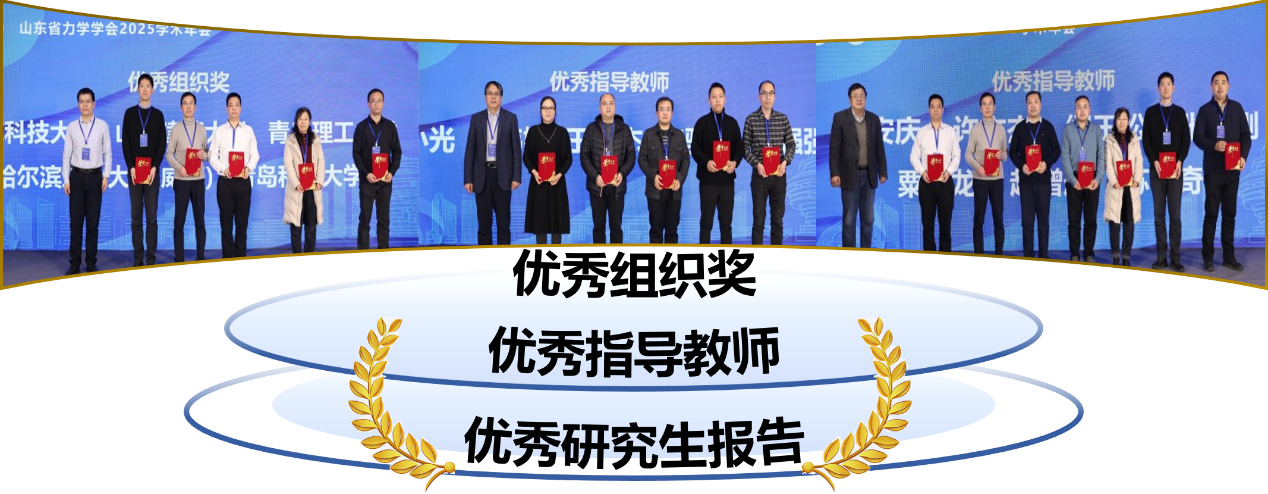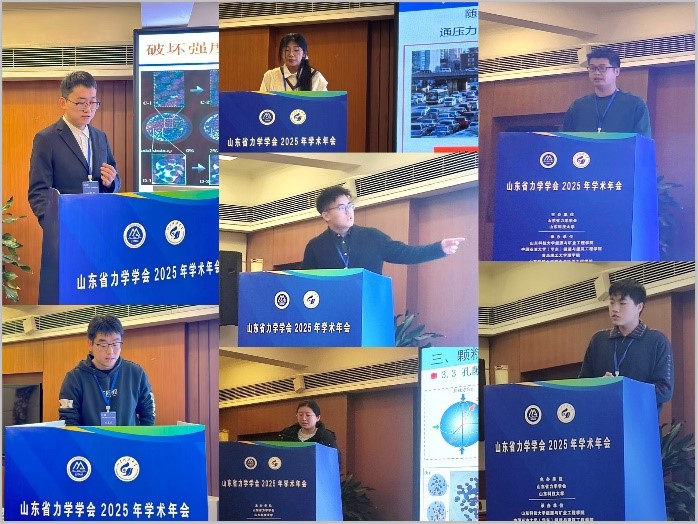 会议设立了“智能材料与交叉力学前沿”“重大工程安全与灾害力学前沿”以及“研究生学术报告”三个专题分会场,共有22位青年学者、22位研究生作分会场报告。与会学者和研究生围绕各自研究领域的最新进展、关键技术挑战与未来发展方向进行了密集而深入的汇报与交流,充分展示了山东省力学研究的创新潜力与蓬勃活力。理学院孔亮教授作题为《泥质粉砂型深海能源土的力学特性及本构模拟》的大会特邀报告。张欣刚副教授作题为《考虑非光滑摩擦的核电厂叠放多体系统耦合隔震机理研究》的分会场报告。赵佳源、吴佳怡、崔超等9名研究生作研究生学术报告。张欣刚副教授获优秀青年学者报告一等奖,赵佳源获研究生报告特等奖、吴佳怡获一等奖、崔超等五位同学获二等奖。缪玉松主任、孟凡震教授主持分会场报告。