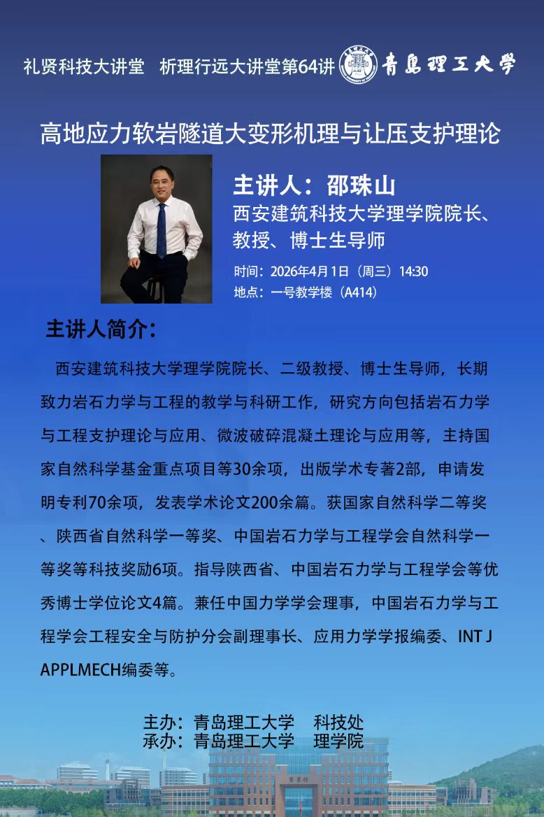 学术预告|礼贤科技大讲堂暨析理行远大讲堂第64讲:高地应力软岩隧道大变形机理与让压支护理论