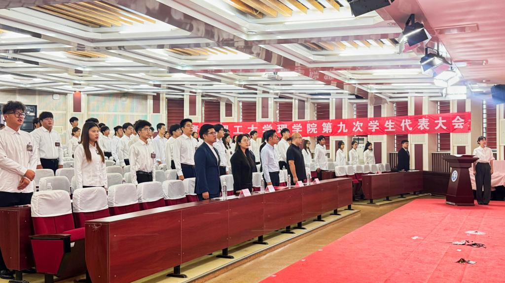 2025年9月27日,理学院第九次学生代表大会和第五次全体研究生大会在嘉陵江路校区主教学楼一楼西报告厅顺利开幕。学院党委副书记、副院长薛诚,学院团委书记、学工办主任刘奕,辅导员王俞苹、王康,青岛理工大学学生会代表杨珂琦以及100余名本硕学生代表参加开幕式。开幕式由刘奕主持。
