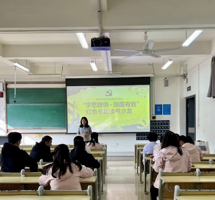 为深入学习贯彻习近平新时代中国特色社会主义思想,传承红色基因,凝聚奋进力量。近日,数学系党支部举办了“学思践悟・强国有我”红色书籍读书沙龙主题党日活动,党支部全体党员参加活动,活动由党支部书记姚惠萍主持。