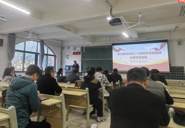 为深入学习领会、全面贯彻落实党的二十届四中全会精神,切实把思想和行动统一到党中央决策部署上来,11 月 26 日,物理系党支部精心组织开展学习贯彻党的二十届四中全会精神主题党日活动。党支部全体党员参加活动,以集中学习、交流研讨的形式掀起学习热潮,推动全会精神入脑入心、落地见效。