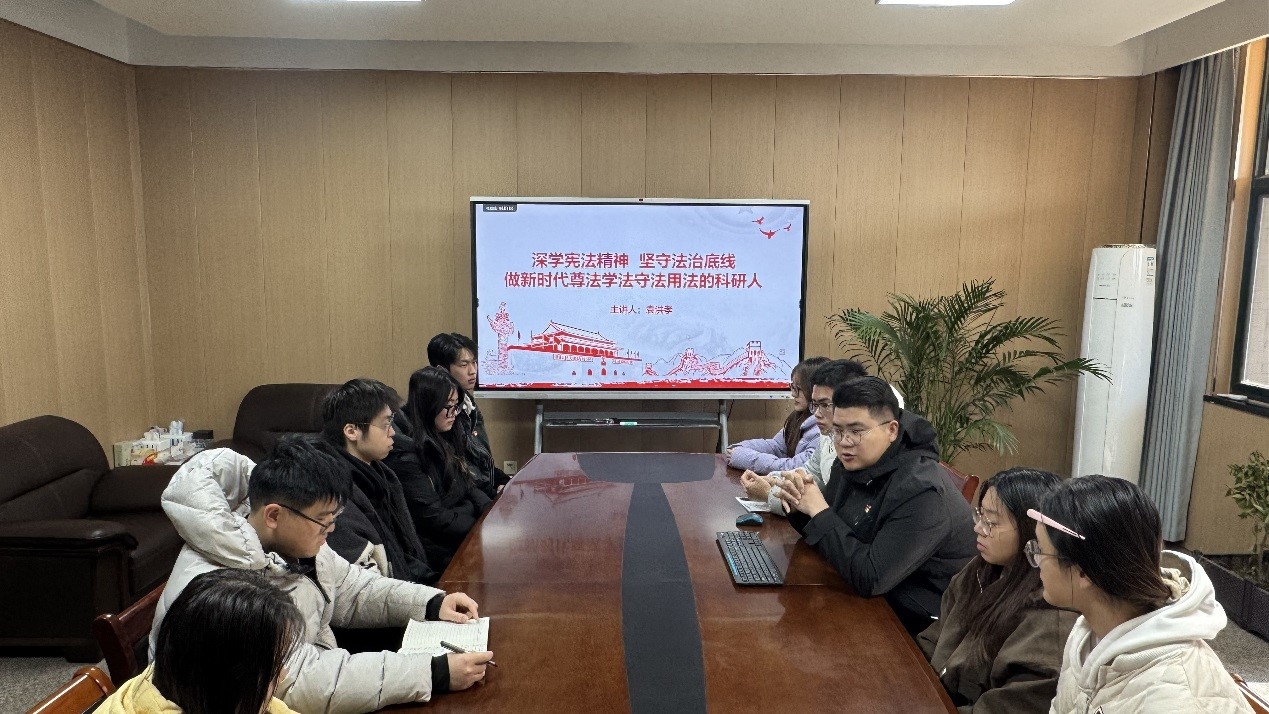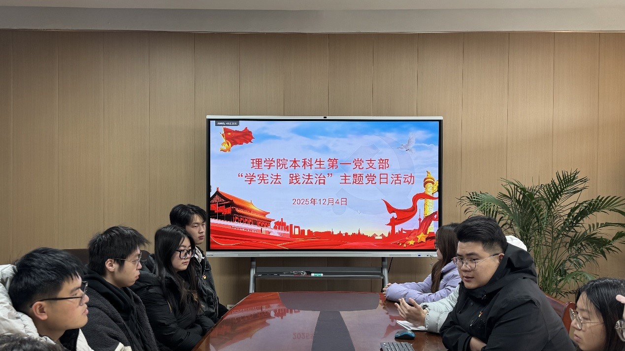 2025年12月4日,正值我国第十二个国家宪法日,为深入学习宣传贯彻习近平法治思想,切实弘扬宪法精神、维护宪法权威,理学院本科生第一党支部以全国“宪法宣传周”为契机,精心组织开展“学习宣传贯彻习近平法治思想,推动宪法深入人心”主题党日活动,通过理论学习与知识竞赛相结合的形式,让宪法精神在青年党员心中落地生根。支部党员代表、入党积极分子代表参加活动,党支部书记袁洪孝主持活动。