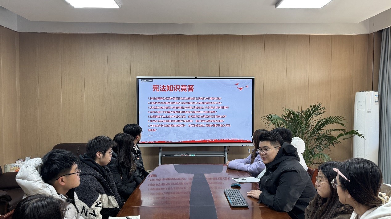 理论学习环节后,活动转入“学宪悟法”互动实践。支部创新设置“宪法知识竞答+案例研讨”双模块,将宪法条文与科研诚信、网络言论规范等校园场景相结合,设计了“实验室数据保密是否涉及宪法规定的公民义务”“学术争议的合法解决途径有哪些”等贴近学生生活的题目。竞答现场气氛热烈,党员们踊跃抢答、激烈讨论,在思维碰撞中深化了对宪法精神的理解。在案例研讨环节,大家围绕“科研成果转化中的法律风险防范”主题,结合数学建模、物理实验等专业学习经历,畅谈如何以宪法为遵循规范学术行为,树立严谨求实的科研态度。