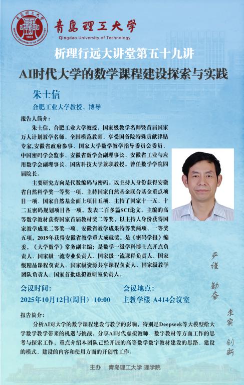 学术预告|礼贤科技大讲堂暨析理行远大讲堂第59讲:AI时代大学的数学课程建设探索与实践